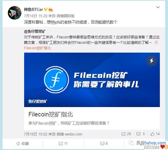 吴说区块链获悉,长期矿池排名第一的比特币矿池鱼池是Filecoin坚定的支持者。鱼池联合创始人、矿业元老、Cobo钱包负责人神鱼,对Filecoin有非常浓厚的兴趣。7月18日鱼池微博发布了一篇非常正面的分析Filecoin的文章,神鱼也对此进行了转发。