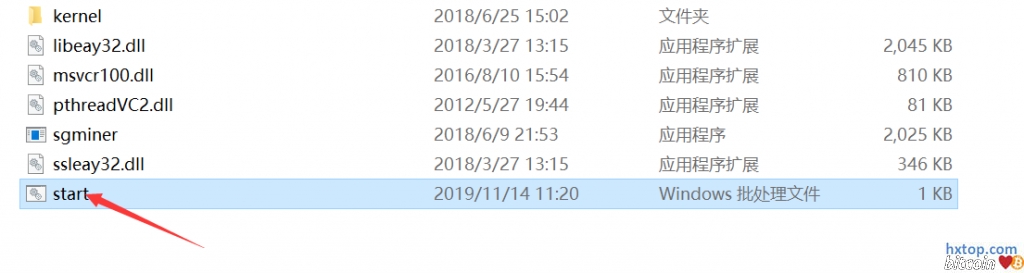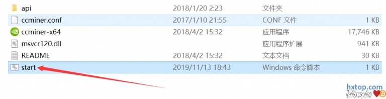 2)ccminer挖矿设置(NVIDIA) 通过上述途径获取ccminer挖矿软件,选择“将文件解压缩到当前文件夹”,找到“start.bat”批处理文件,如下图所示: