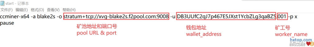 右键点击“start.bat”,选择“编辑”,在“start.bat”文件中,各项参数设置如下: ccminer-x64 -a blake2s -o stratum+tcp://xvg-blake2s.f2pool.com:9008 -u 钱包地址.矿工号 -p x 钱包地址与矿工号(给机器命名,自定义如编号或字母组合)使用英文句号隔开。修改的时候只把钱包地址和矿工号对应的字符修改掉,空格、标点均不要增减。 如下图所示:
