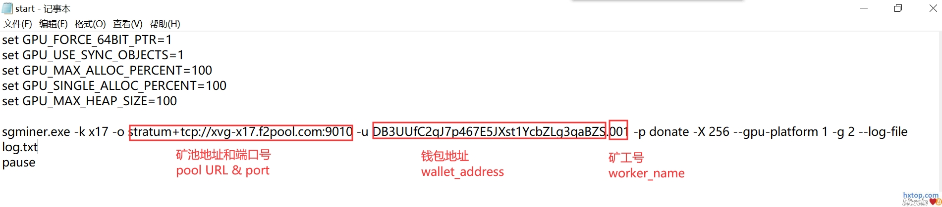 右键点击“start.bat”,选择“编辑”,在“start.bat”文件中,各项参数设置如下: set GPU_FORCE_64BIT_PTR=1 sgminer.exe -k x17 -o stratum+tcp://xvg-x17.f2pool.com:9010 -u 钱包地址.矿工号 -p donate -X 256 --gpu-platform 1 -g 2 --log-file log.txt 钱包地址与矿工号(给机器命名,自定义如编号或字母组合)使用英文句号隔开。修改的时候只把钱包地址和矿工号对应的字符修改掉,空格、标点均不要增减。 如下图所示: