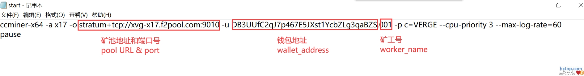 右键点击“start.bat”,选择“编辑”,在“start.bat”文件中,各项参数设置如下: ccminer-x64 -a x17 -o stratum+tcp://xvg-x17.f2pool.com:9010 -u 钱包地址.矿工号 -p x 钱包地址与矿工号(给机器命名,自定义如编号或字母组合)使用英文句号隔开。修改的时候只把钱包地址和矿工号对应的字符修改掉,空格、标点均不要增减。 如下图所示: