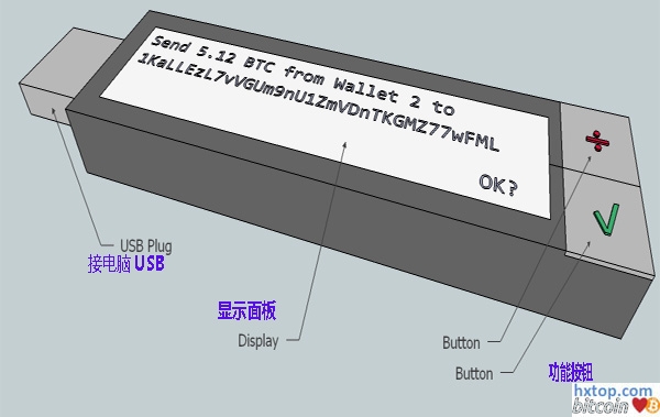 Easy, you say? Describe a transaction workflow! 很简单?交易流程描述! OK, say you want to make a transaction. You fill out four things in the PC client: the wallet to transfer from, the amount of BTC, the destination address and the password for the wallet. You press OK, and the transaction is sent to the device via USB for signing. On the device you see the amount, wallet and destination, and you press the OK button. The device sends the signed transaction back to the PC, and the PC client publishes the transaction on the 'net. 假如你想进行一个交易.在PC机的比特币客户端上你先确定四件事:从哪个钱包交易,帐户里的BTC数量,发往对方的钱包地址和这钱包的密码. 按下OK键,然后信息将通过USB传输到硬件比特币钱包设备,现在你可以在硬件比特币钱包设备的显示面板上看到钱包帐户信息和对方钱包地址,按下设备上 的OK按钮,设备将会把签证信息发回PC钱包客户端,然后PCPC钱包客户端将公告这个交易到网络上.