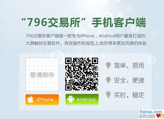 | 796交易所手机客户端安卓初版今日上线。796交易所致力于为您提供安全、快捷、稳定的比特币/莱特币虚拟期货合约服务, 通过796手机客户端您可以随时随地的进行虚拟期货合约交易、时刻关注自己的账户变动情况。