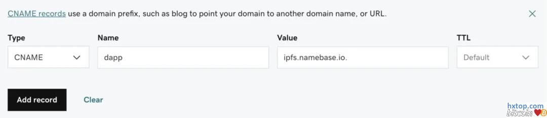 在本教程中,我们只将子域dapp.lechneralexander.com指向dApp,所以让我们首先添加一个CNAME条目,将主机设置为dApp,并将值设置为gateway.ipfs.io。