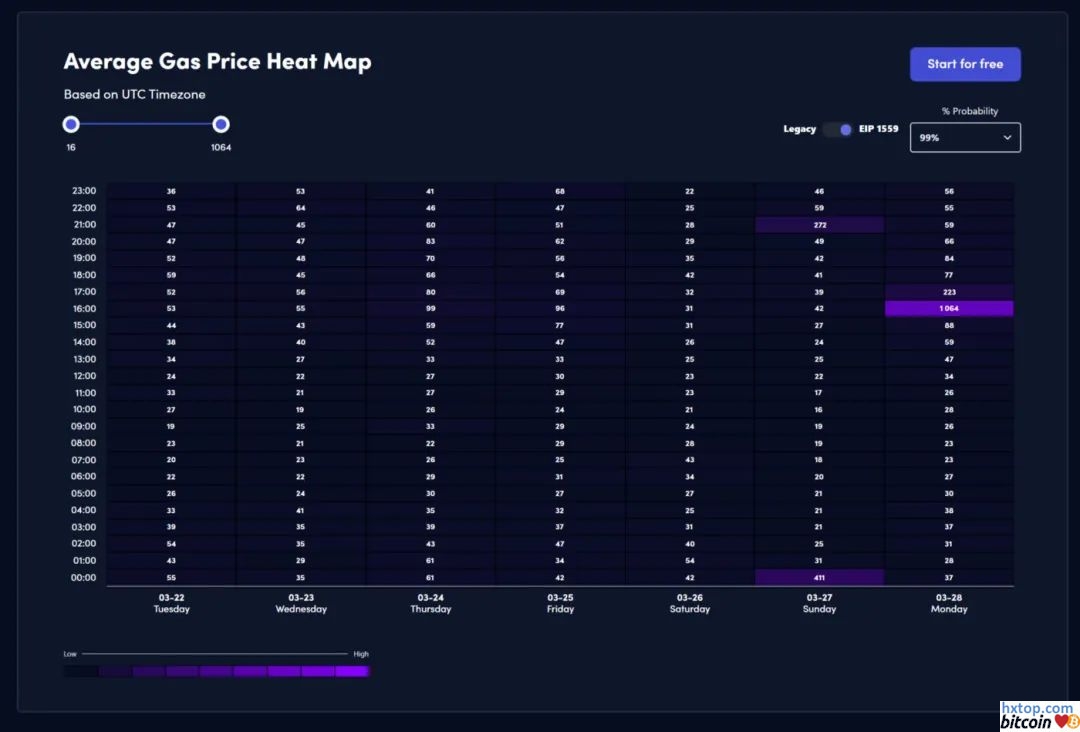 要了解更多细节,我们也可以在同一页面上查看他们的Heat map,以显示一天中特定时间的平均gas价格。