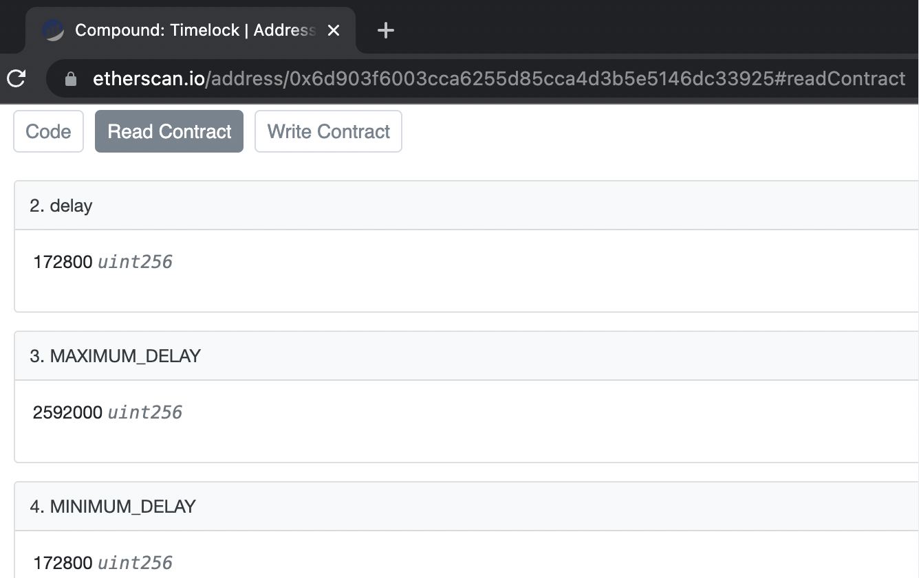 链上可以直接看到 Timelock 的时间锁(delay 参数)是 48 小时(172800 秒):