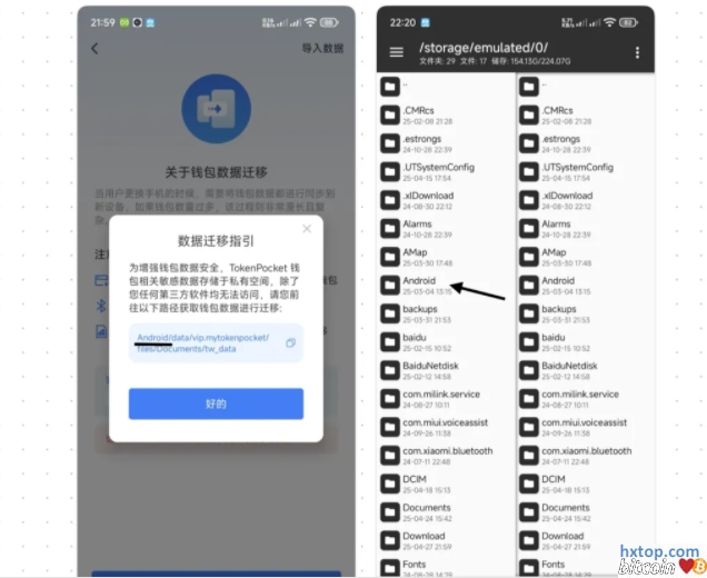 下载安装完,第一次打开会弹窗让你登录,这里不用登录,直接点击旁边区域,将弹窗关闭即可正常使用,下方是对比图,Android就是系统根目录,Android/data/ 是所有 APP存储自己的数据的目录。我们就参考下方左侧图示,一步一步往里面找。注意 Android/data 点进去后,会发现列表很长,我们需要的 vip.mytokenpocket 目录几乎在列表最下方了。