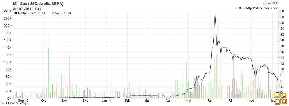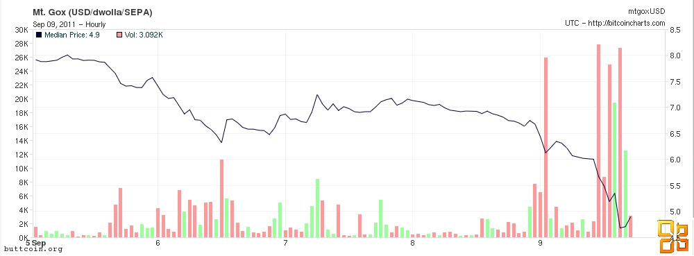 Bitcoin最近跌得很厉害,已低于过5美元的大关,其已失去了35%的价值.而且存在大规模抛售行为.看图吧: