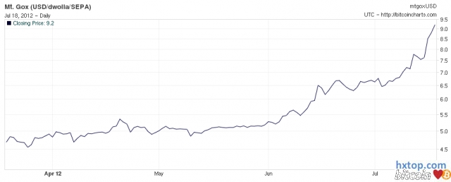 本周Bitcoins的价格上涨,近一年来首次上升至9美元以上。表明日益增长的公共利益和cryptocurrency对等。今年四月以来的Bitcoins交易量急剧增加。今年四月,很少有超过10,000交易量在一天中。到七月时一直有超过20,000交易的每一天。今天,一个Bitcoin是价值约9.20美元,在一个月内增加了40%。什么能解释cryptocurrency的新发现和普及呢?我们怀疑如色情和赌博仍然是一个货币价值的重要因素。而且德国一学生已经建立了一个Bitcoin的自动售货机.等利好消息的出现也是比特币大涨的一个因素.