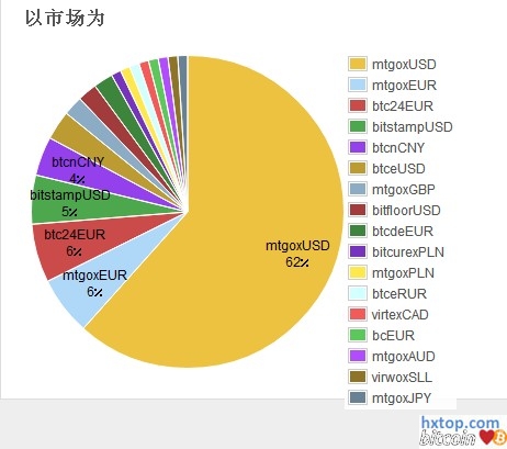 按市场分MTGOX还是以美元为主.占有百分62左右的市场,不愧为第一大交易市场.