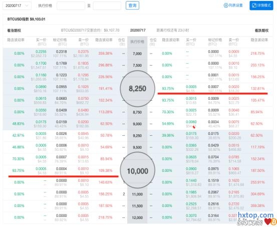 期货版:6300抄底,3倍-5倍杠杆安全得很。不好又跌了44%,2.5倍杠杆以上全挂。眼看第二周价格就回来了,财富却失之交臂。 期权版:6300抄底,跌了三周,三周估计能涨回来,选一周的风险大点,选两个月估计安全。又跌了44%,没问题。第二周有希望了,两个月大丰收。 7 OKEx期权深入 点全部期权。左边看涨,右边看跌,最近的20200717期权涨跌各15种,共计30种。这里中规中矩和其他交易所差不多。 中间“执行价格”是最重要的。两边挨着的是我们的“仓位” ,负数是“卖空”。三个“价”,都好理解的。先知道“隐含波动率”,“大”就“贵”就够用。 记住红线和两个圆圈,下面会用。买一价,空着的就是说你卖没人买。