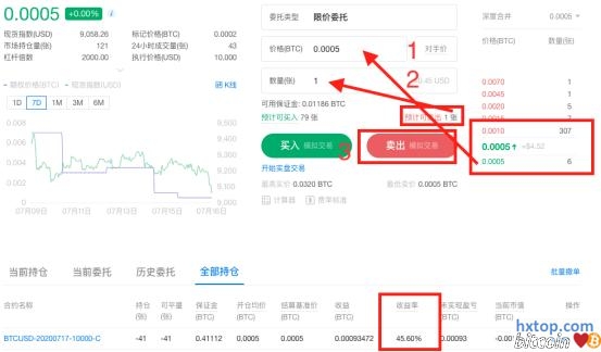 购买20200717期10000的看涨期权和8250的看跌期权的投资者大概率都是要亏钱的,所以做空他们大概率就会捡到钱。 点全部期权,点击上上图红线10000和8250,进去抄上“价格”,“数量”,点击“卖出”。翌日到期自动行权,大概率就能捡钱了。