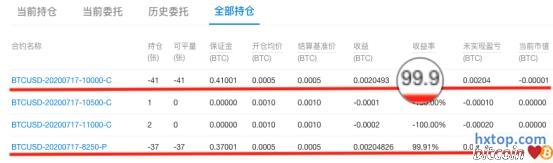 这种玩法是高概率的小盈利,去覆盖低概率的大亏损,有点保险的模式,积少成多。除此外知道卖空期权要保证金,买期权不需要就差不多了。 两个订单 BTCUSD-20200717-10000-c(c是call看涨就“喊叫”),BTCUSD-20200717-8250-p(p是put看跌就“放下”),次日都是99%的收益率
