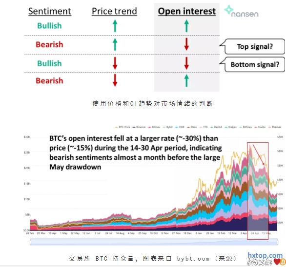 未平仓合约(OI)衡量加密货币市场兴趣的另一种方法是看基于成交量的指标;例如,我们可以看一下市场上有多少合同正在交易等。 未平仓合约是比较流行的基于交易量的指标之一,它说明了市场参与者在任何特定时间点所持有的未平仓合约(包括多头和空头)的总量。 换句话说,未平仓合约是所有未平仓交易头寸(多头和空头)的总和减去已平仓的交易。 为什么未平仓合约很重要?它是资本流入市场的一般指标。 当更多的资本流入时,未平仓的数量就会增加,反之亦然。出于这个原因,它也被视为市场情绪的一个指标。 由于未平仓合约包括多头和空头未平仓合约,未平仓合约的高值通常表明价格的波动性增加。因此,当与价格趋势相结合时,未平仓合约可用于确定市场顶部/底部。 例如,如果一项资产的价格与它的未平仓合约一起上涨,它可能表明一种看涨的情绪。反过来说,如果价格在上升,但未平仓合约在下降,这可能意味着情绪看跌,价格走势背后的力量减弱。