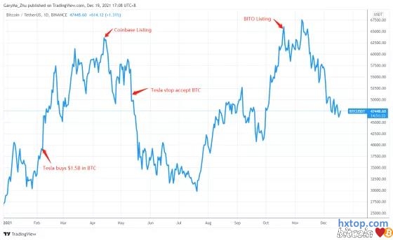 2021 年截至 12 月 19 日,比特币全年的收益回报约为 63%,期间最高涨幅约为 130%,最大回撤率高达 52%。可以说,今年比特币的行情走势还是较为崎岖波折。 2 月 8 号,特斯拉官宣购买价值 15 亿美元的比特币,为 2020 年由灰度比特币基金套利推动的比特币行情续命;在 Coinbase 直接上市纳斯达克的推动下行情直接达到顶峰,随后在全球碳中和的政治正确下,特斯拉的反水吐槽比特币的 PoW 挖矿,再加上宏观调控的不确定性,市场迎来了 519 腰斩行情。