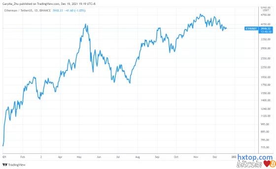 而伴随行情突然的暴跌以及持续的阴跌,我们从链上数据可以清晰地看出,比特币长期持有者(LTH)在疯狂地吸筹;很快,比特币长期持有者的总持仓就突破前高,而比特币行情也在市场的各种板块轮动行情下,再创新高。有趣的是,美国首只比特币期货 ETF 的通过的时间点,目前来看又是行情的一个顶点。Buy the Rumor, Sell the News! 当下,比特币已经从高点回撤近 30%,鉴于未来的宏观调控预期,似乎市场情绪整体也偏向消极,但链上数据(比特币长期持有者供应 & 交易所比特币余额)都相对乐观,这也是乐观者看多后市的主要原因。 回顾比特币的 2021 年,已经解锁了众多成就。企业机构的认可、美国比特币期货 ETF 的通过、曾踏入万亿级别资产、成为国家法定货币(萨尔瓦多)等。 在价格上,虽然今年无法实现 10 万美元的期望,与热点板块的收益表现也差距很大,但是或许这就是我们需要习惯的事实,比特币价格的波动性将逐渐收敛,并且与行业内的细分板块的价格相关性会逐渐脱离。而在接下来的 2022 年,随着 Taper 加息政策的落实,我们将见证比特币是尚停留在风险资产类别上,还是真的成为了抗通胀的价值存储资产类别。 至于在基本面上,我们能进一步期待的,可能只有美国比特币现货 ETF 的通过以及更多国家的认可。 以太坊