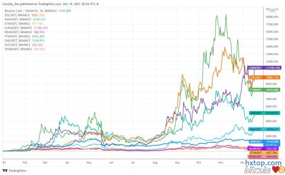 2021 年截至 12 月 19 日,以太坊全年的收益回报约为 431%,年间最高涨幅约为 557%,519 期间最大回撤率也高达 57%。 去年以太坊生态上爆发了 DeFi 热潮,今年则是更上一层楼,NFT、GameFi、DAO 以及 Web3.0 等板块都十分火爆。而 8 月 5 日激活的 EIP1559,更是弥补了 ETH 经济模型上的短板,完成了 ETH 对生态繁荣的价值捕获。同时,在可扩展性 L2 方案上,也有了质的进展。 展望明年,其中最值得期待的势必为 PoS 合并,届时结合 Rollup 等 L2 方案,能将以太坊的吞吐量提升到怎样的一个层次,以太坊生态应用以及流动性资金会如何演化,都是万众期待的问题。 多链 L1s