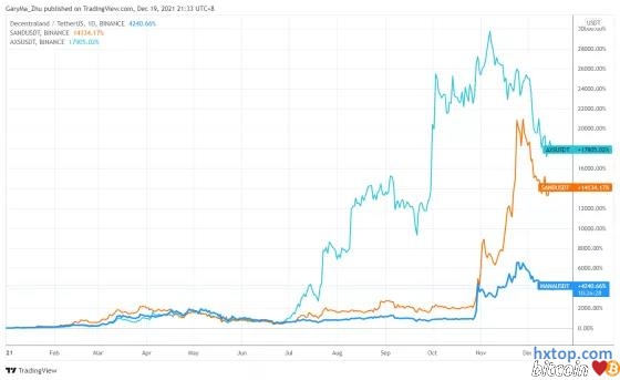 今年下半年,在 Axie Infinity 的引领下,GameFi 赛道全面爆发。Axie(AXS) 作为赛道龙头,截至 12 月 19 日,全年的收益回报为 167x,期间最高收益回报为 300x。 10 月 28 日,Facebook 宣布公司改名为 Meta,聚焦于打造元宇宙世界。这一消息再次引爆元宇宙赛道,而 Decentraland(MANA) 和 The Sandbox(SAND) 作为赛道龙头,随即也迎来指数型暴涨。截至 12 月 19 日,MANA 全年的收益回报为 31x,期间最高收益回报为 47x。SAND 全年的收益回报为 119x,期间最高收益回报为 175x。而它们的主要涨幅,基本上都是在 Facebook 宣布后一个月内完成的。 尽管今年加密行业内元宇宙以及 GameFi 赛道的项目具有亮眼的收益表现,但是当前这些赛道都处于早期阶段,鱼龙混杂,可能大部分项目都无法熬过一轮周期,但随着资本和人才的不断涌入,这些赛道有望脱离小众走向主流。 DeFi