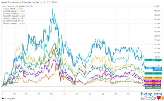 众所周知,加密行业的节奏热点切换极快,这不,一年前大火的 DeFi 板块,现在已经被称为 Old Money 了。而失去了市场热度的 DeFi 板块,收益表现也十分一般,部分项目代币甚至跑不赢比特币。 上图展示了2021 年截至 12 月 19 日以来,主流 DeFi 代币的收益表现,具体排序为:MKR(317%)、UNI(221%)、BNT(155%)、AAVE(104%)、LINK(68%)、YFI(47%)、COMP(41%)、BAL(30%)。