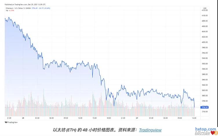 加密市场正在低谷徘徊,这将是今年自5月以来最糟糕的一个月。自12月初以来,以太坊的交易额高达4780美元,但ETH已经损失了20%的价值。 仅在过去的48小时内,ETH就已经损失了超过8%的价值。这种下跌使ETH的价格跌至3,756美元。