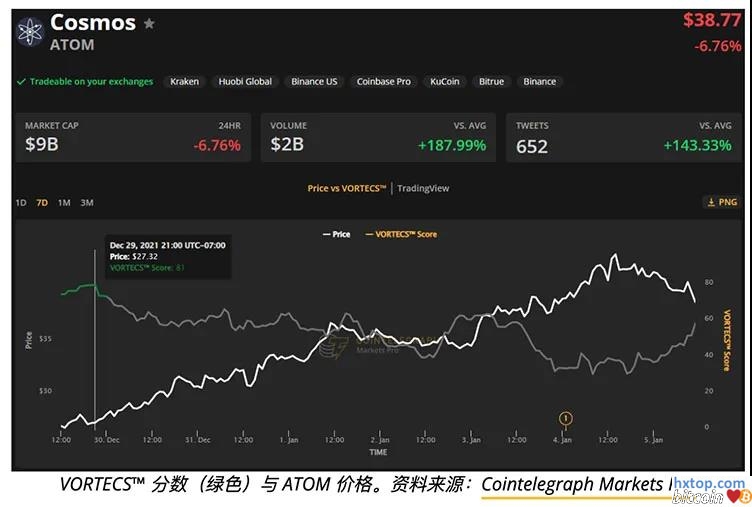 如上图所示,ATOM的VORTECS?评分在12月28日开始回升,并在接下来的六天内价格开始上涨67%时攀升至81的高点。 |