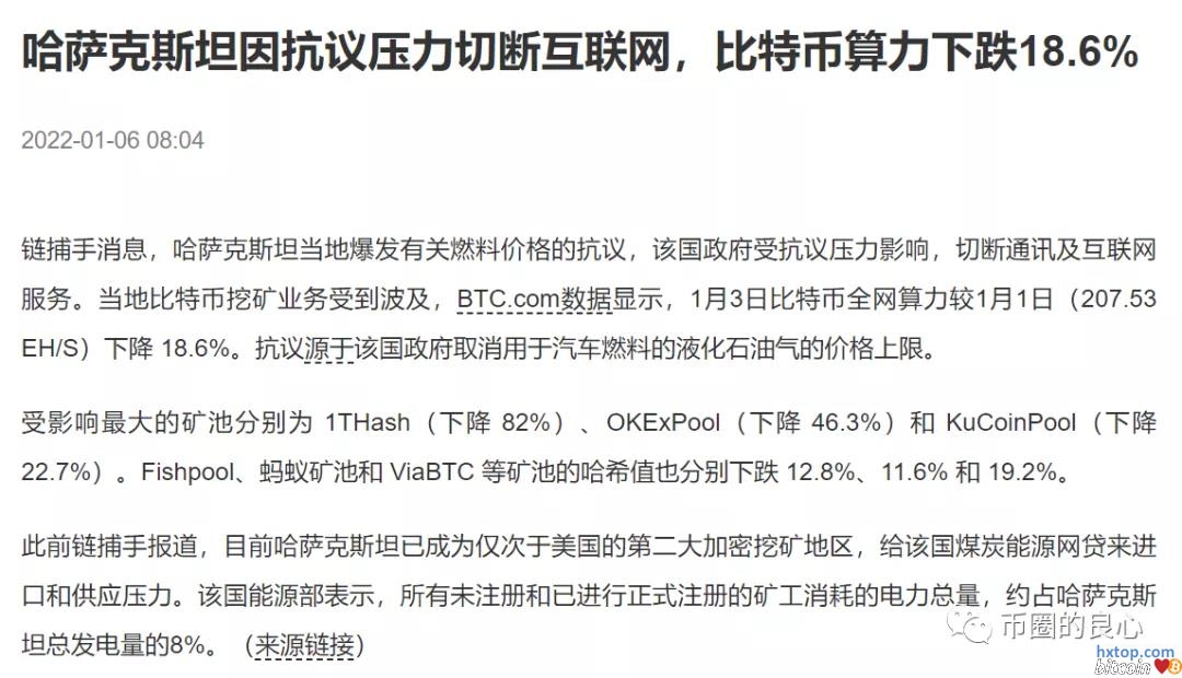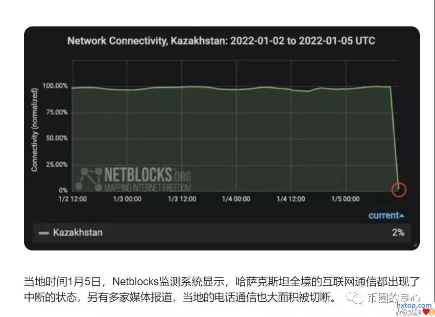 随后哈萨克斯坦的总统表示全国进入紧急状态,并声称此次行为是有组织有预谋的,而且参与者受过专业的训练。 为什么会讲到哈萨克斯坦的动乱,是因为随着比特币算力去中国化之后,哈萨克斯坦承担了一部分从国内分流出去的算力,在此之前哈国政府对此是不做限制的,而且电费算下来折合不到3毛钱人民币,非常便宜。 而为什么哈萨克斯坦的电费如此便宜?这就要讲一讲哈国的地理了。哈萨克斯坦拥有丰富的石油资源,拥有的油气资源排行世界第11名,年出口额曾经排到了全球第九位,占全球石油出口总额的3.3%,你可能想象不到,哈国的发电是靠烧天然气驱动的。本次的暴动原因,则是因为液化天然气的涨价,从从原本的每升60坚戈(约0.9元人民币)涨至每升120坚戈(约1.8元人民币)。这其实非常便宜了,但因为政府长期有补贴,并且长期以来一直有人将国内天然气卖到国外去赚差价,导致国有资产流失严重,一方面是国有企业长期亏损,甚至设备老化都没钱去修,一方面是很多人将低价的资源运到邻国去赚钱,典型的被羊毛党薅秃噜皮了。哈国政府就想将定价权交由市场扭转这一局面,抹平这中间的价格差,所以液化天然气的价格就翻倍了。 那在一些其他因素下面,就造成了我们今天看到的局面。 在这种情况下,哈国的互联网通信几乎全部中断,于是——比特币矿机也都纷纷掉线。