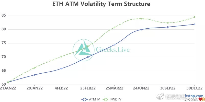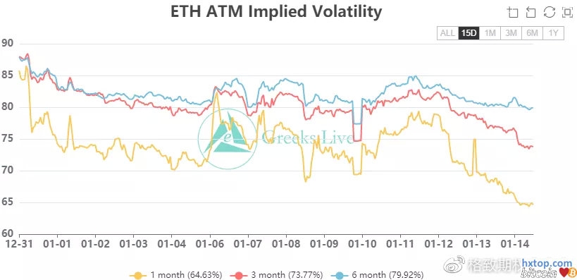【IV】 各标准化期限IV: 今日:1m 65%,3m 74%,6m 80%,DVol 72% 1/14:1m 66%,3m 76%,6m 80%,DVol 74% 以太坊维持3300美元震荡,目前短期RV仍有71%,这和直观感觉有一定出入,个人感觉要低于这个数。横盘造成期权各主要期限IV继续小幅下跌,不断刷新新低。