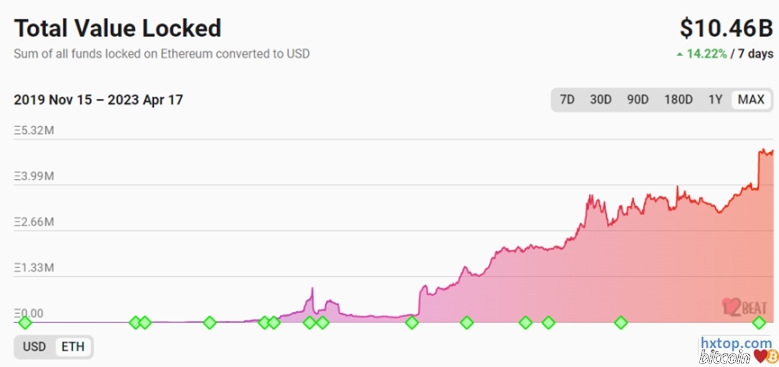 2. 总锁仓量 TVL (Total Value Locked),达 104.6 亿美元,过去 7 天涨幅为 14.22%。