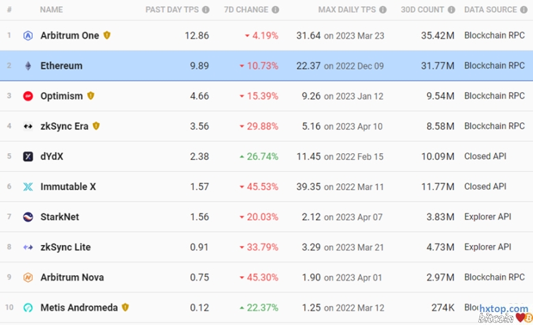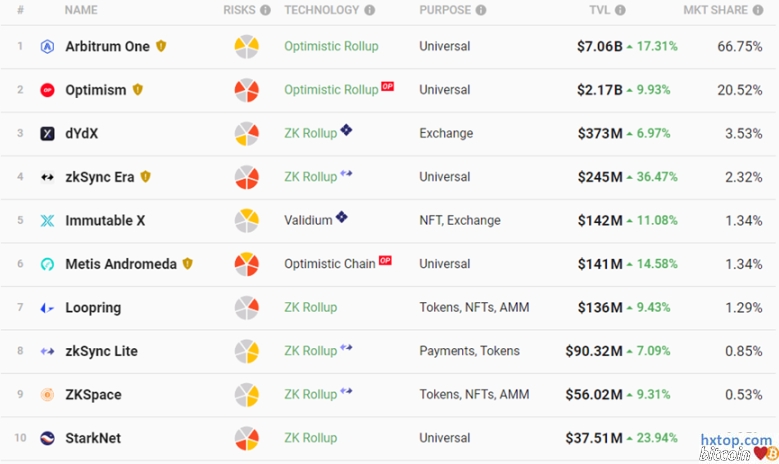 从以上这些数据可见,受先发优势影响,当前 L2 赛道 Arbitrum 和 Optimism 已经占据了整个赛道 87.27% 的锁定份额,两者同属 Optimism Rollup。其中,Arbitrum One 网络总锁仓量为 70.6 亿美元,独占总额的 66.75%,甚至过去 30 天的交易总数已经超过了以太坊; Optimism 网络总锁仓量为 21.7 亿美元,约为 Arbitrum One 的 1/3(20.52%)。而 ZK Rollup 的项目当前的市场份额还很小。不过总体而言,整个赛道的所有项目都在上升通道,自 23 年 1 月份低点以来整体 TVL 已经上涨约 36%。
