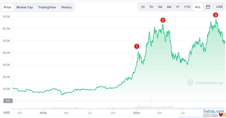 图/比特币在2021年再次达到历史新高,创下了三个峰值。 2021年1月峰值约为4.1万美元,4月中旬达到6.3万美元,11月达到约6.9万美元。 币安提供