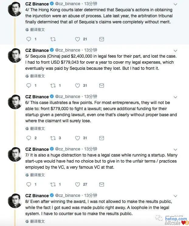 1、大多数人可能不知道我与红杉案的最终结果。总之,仲裁庭驳回了红杉的所有诉讼请求。 2、我赢了,但这个案子很有破坏性。红杉公司对我发出了禁令,阻止我在2017年底为Binance融资。当时其他风投和投资者对Binance很有兴趣,这在当时对Binance很关键。 3、禁令和红杉对我的指控都是公开的,但我却不能公开辩护,因为仲裁是保密的。 4、香港法院后来判定红杉申请的禁令是滥用程序。去年年底,仲裁庭最终裁定红杉的所有索赔都毫无根据。 5、红杉中国因败诉支付了240万美元的诉讼费。我也不得不在这一年多里支付779043美元法律费用,不过因为红杉败诉这最终都由红杉支付了。但此前我得先出这些费用。 6、这个案子说明了一些问题。对于大多数企业家来说,他们将无法支付77.9万美元来打官司;初创企业背负着悬而未决的官司想争取额外的资金很难,即便这场官司里索赔人(原告)注定会输。 7、在经营一家初创公司的同时背负官司是个很大的干扰。许多初创企业别无选择,只能屈服于风投所采用的不公平的条款或做法。 8、我即使在胜诉之后也不能公开结果,然而我被起诉的事却被马上公开。这是法律体系中的漏洞。我必须反诉才能公布结果。 9、对于风投来说,这种策略在大多数情况下都是奏效的。这是他们合法使用的工具。这既是我们法律体系中的一个弱点,也是风投的不专业的行为。我不知道还有多少像这样的案子,但风投应该帮助企业家。 10、我们不仅仅是防守,而是为行业而战。(译文) 04古典投资霸王条款碰钉子? 有业内人士对此评价:“红杉拿着古典投资的霸王条款,来区块链里面玩,碰到钉子了?得不偿失啊,B圈交易所可比基金牛多了 。” 还有观点认为,这是红杉“拖延投资”风格的第一次失足。 大牌投资机构拖垮创业公司早有争论,但红杉确是有案例在先。 2014年,口袋购物日前公开指责红杉资本,称被红杉“放鸽子”。当时加班加点跟红杉沟通投资,拖了十几个月之后了无音讯。 王珂说,红杉以前这样拖死过很多项目,如ispeak就被拖死,是被红杉拖7个月给毁掉的。 不排除一些大牌的投资方将拖延作为一种战术。 首先一拖再拖,暗地里是在向创业公司压价。因为一家公司被红杉这样专业大牌的机构看过10个月后都没有获得投资,其他投资人会认为这家公司可能有问题。 而此时,创业公司可能会处于资金链断裂阶段,创始人基本崩溃,要么折价,要么倒闭出售。 还有创业者透露,红杉发TS(投资意向书)的速度绝对是B圈的速度(非常快),但是发完TS,就不管你死活了。 而这次,红杉遇到了发展贼迅速的B圈交易所,一日千里,“拖延”策略失足了。