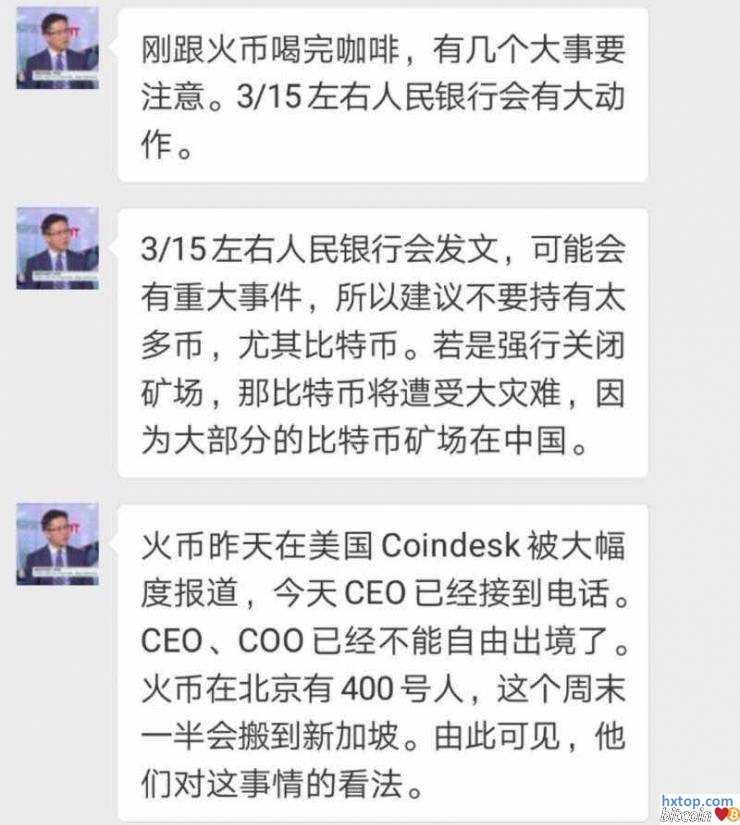 一张在圈内流传的微信对话截图显示:央行将会在 315 期间“有动作”,并称火币 CEO 和 COO 已经被限制出境。甚至有人说,不排除采用叫停矿厂挖矿的严厉措施。