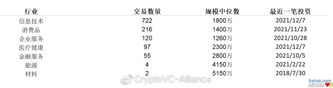 数据来源:Pitchbook 根据 Pitchbook 的数据,截至目前,a16z 对软件领域的投资数量(包括信息技术和企业服务)有 842 起,在整体投资中占到了 69.25%;其次,a16z 对医疗、金融服务相关的投资也比较多。这源于 2019 年初,a16z 曾提出的其计划布局的五大技术趋势,其中包括生物医疗、数字货币、区块链、人工智能以及金融科技等行业。