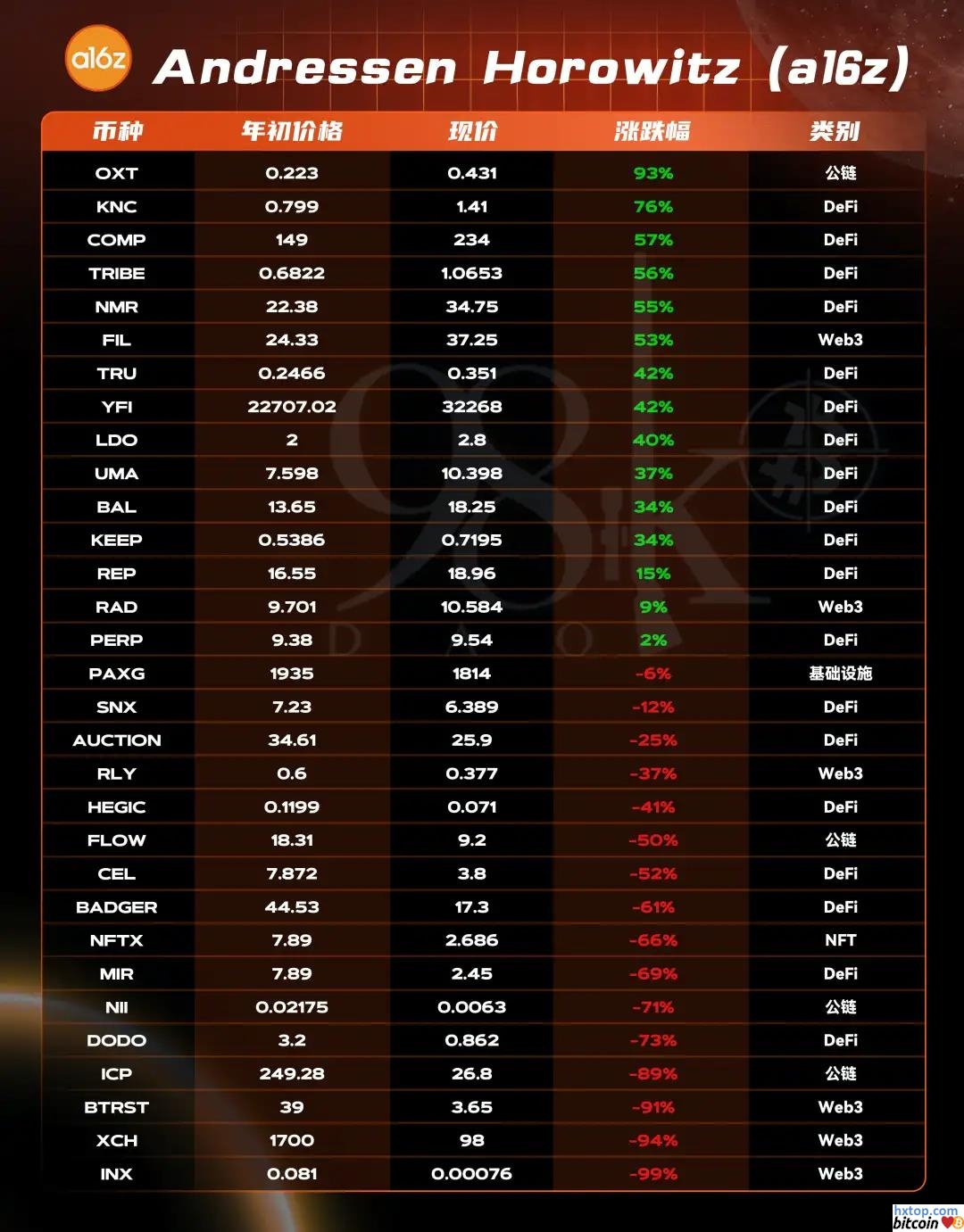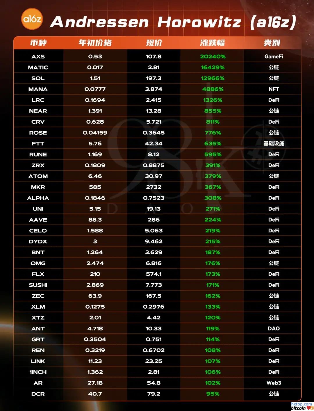 以下数据为a16z所投资且已发币项目在2021年的币价表现: