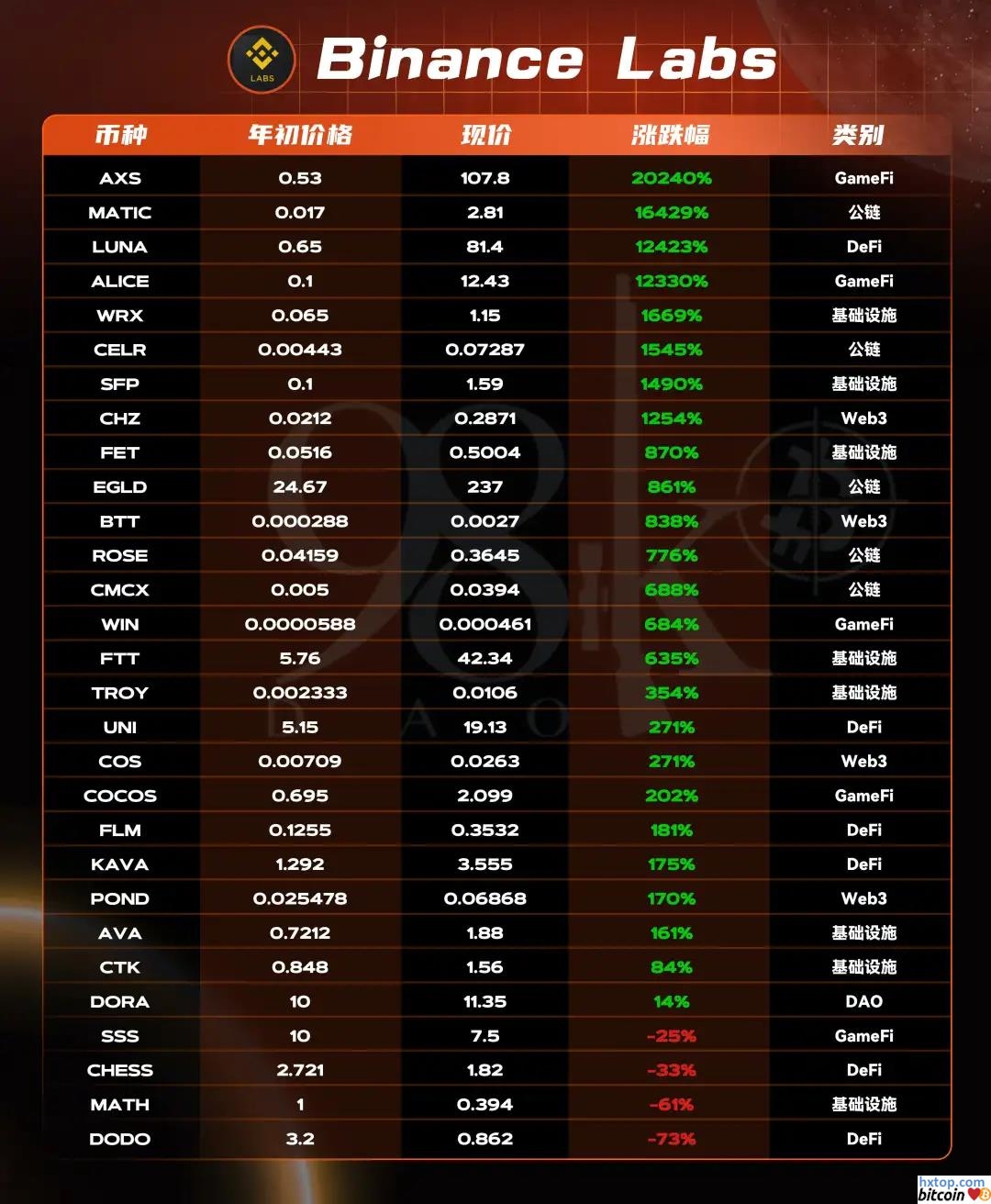 未发币项目总数量为5个,其中Web3项目占比80%。 Binance Labs机构介绍:世界第一大加密货币交易所 Binance 旗下的社会影响基金,旨在为区块链和加密货币企业家;项目和社区提供孵化、投资。 以下数据为Binance Labs所投资且已发币项目在2021年的币价表现:
