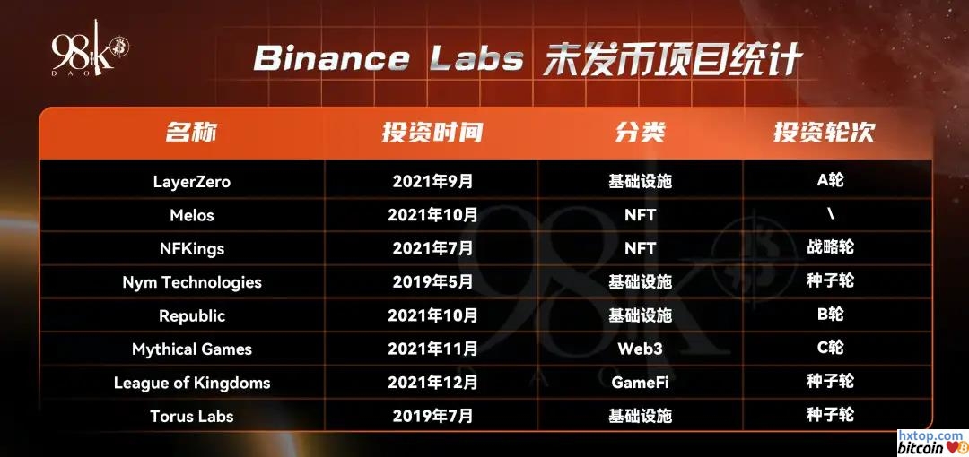Binance Labs的投资组合的正涨幅率接近90%,在已上币的28个币种中有 ALICE、LUNA、MATIC、AXS四个百倍币,是所有机构中最多的;10倍左右的币种也有4个,1-10倍的占比超过50%,小于一倍的币种只有两个,也是所有机构中最少的。 从项目分类来看,Binance Labs的投资风格较为多元化,基础设施、公链、DeFi、GameFi数量非常接近,没有出现对单一赛道的过分侧重。 以下统计为Binance Labs已投资但未发币项目:
