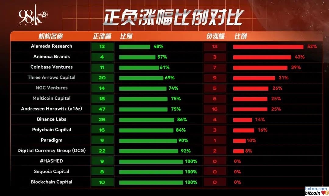 从整体数据来看,各个机构投资组合今年的表现都不错,有三家机构的投资组合正涨幅率为100%,正涨幅率超过70%的也有十家,有且只有一家的正涨幅率低于50%,正涨幅币种比例近80%。
