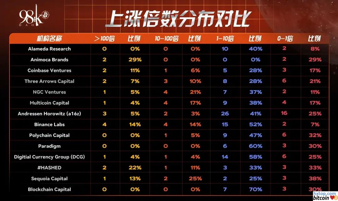 我们以1倍、10倍、100倍做区间划分,涨幅小于一倍的占到25%,有占总币种40%的币种涨幅集中在1-10倍,10-100倍的只占到10%,同时70%以上的机构都有1-3个百倍币出现。 在涨幅最大币种排名中AXS以202倍位列第一,同时也是投资机构数量最多的项目,其次是MATIC(164倍)、SOL(129倍)。百倍币共有6个,分别是AXS 202倍、MATIC 164倍、SOL 129倍、LUNA 124倍、SAND 158倍、ALICE 123倍,a16z投中了3个百倍币,数量最多。