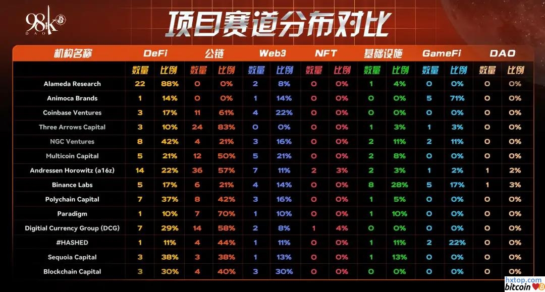 从投资项目的分类对比来看,大部分机构最看好的依然是DeFi赛道,其次是公链和Web3。DeFi占比最高的机构是Three Arrows Capital,占比高达83%。在GameFi赛道,押注最多的是Animoca Brands,它以71%的占比遥遥领先其他机构,排名第二的#HASHED占比仅为22%。 不得不说的是,2021年GameFi、元宇宙大火,投资机构也投资了很多GameFi项目,但由于游戏项目开发周期较长,很多项目还未到发币的阶段,因此GameFi占比普遍较小。 |