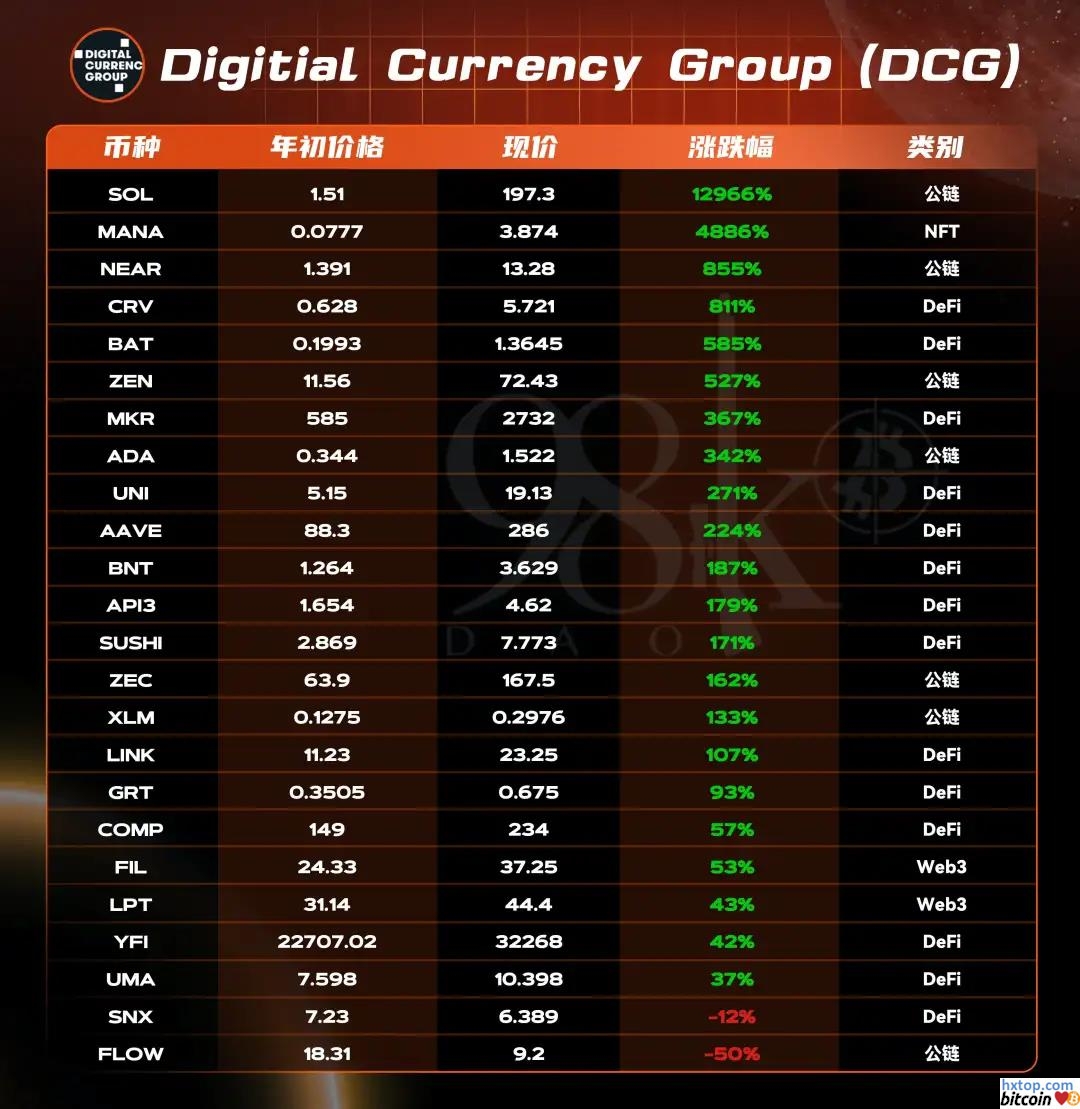 未发币项目总数量为37个,其中基础设施(17个)占比46%,其次是GameFi和Web3,各有8个。 DCG(Digitial Currency Group)机构介绍:区块链创业公司孵化器,Coindesk、灰度母公司,是一家专注于加密与区块链行业的投资公司,投资组合超过100家公司。 以下数据为DCG所投资且已发币项目在2021年的币价表现: