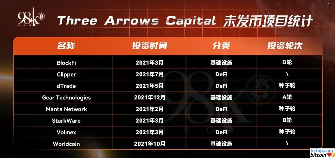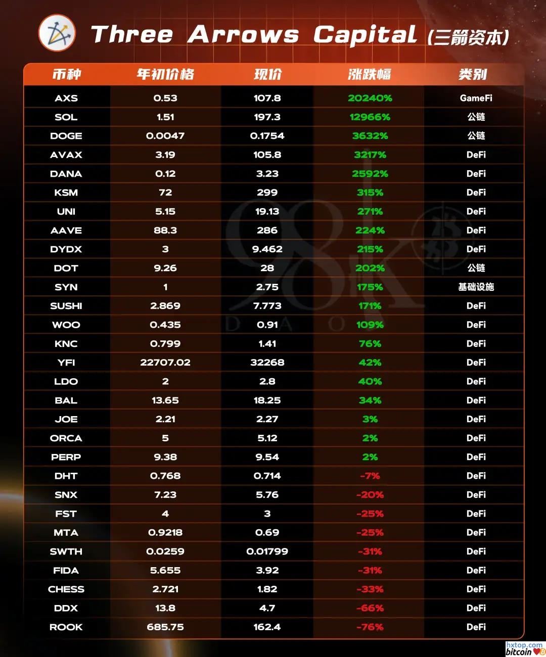 以下数据为Three Arrows Capital所投资且已发币项目在2021年的币价表现:
