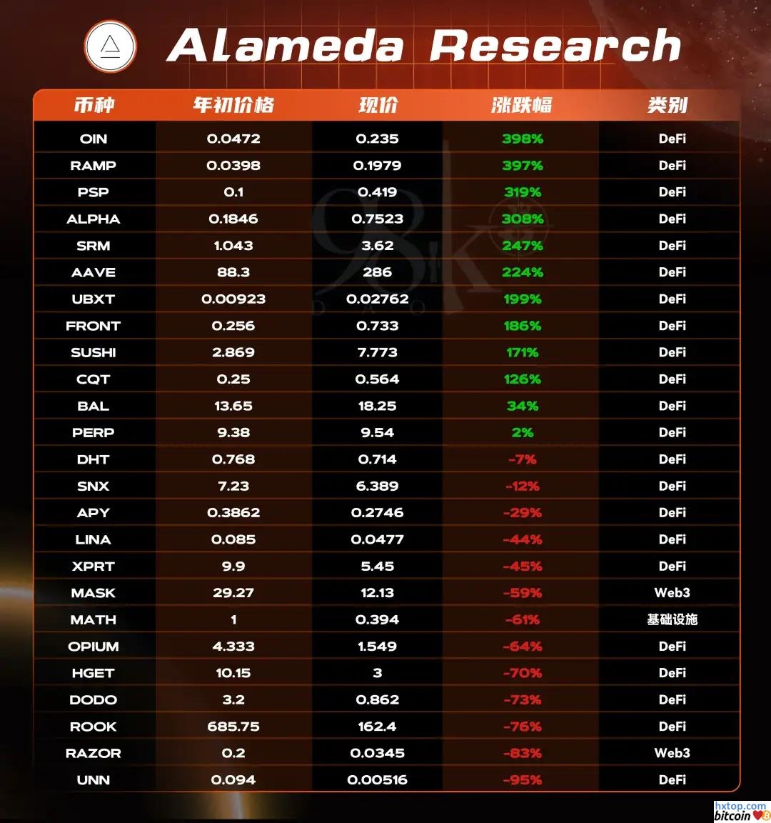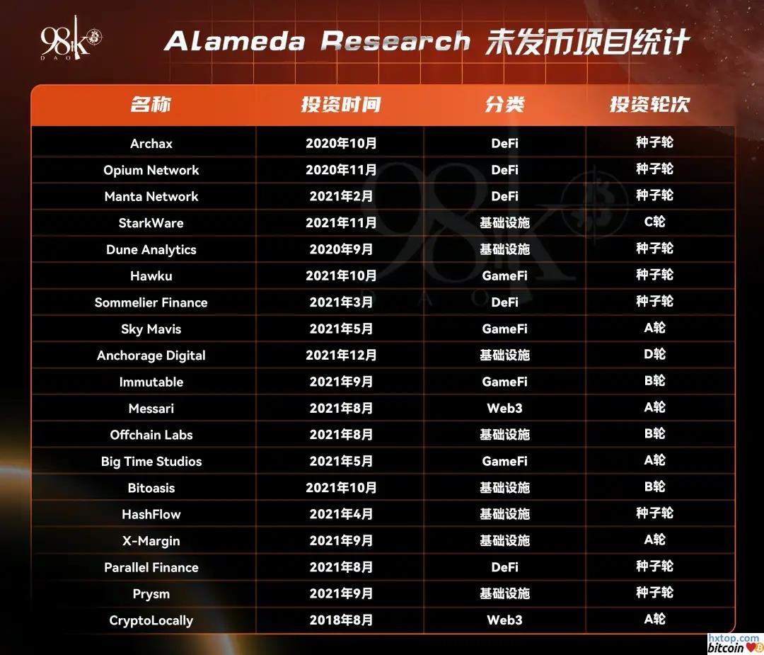 Alameda Research在所有机构的投资组合中正涨幅率是最低的只有48%,最大涨幅币种的也是所有机构中最低的只有398%,投资组合的涨幅集中在1-3倍占总数的40%,小于1倍的占8%。 从项目分类来看,DeFi项目有22个,占比88%,剩余的12%为Web3和基础设施。 以下统计为Alameda Research已投资但未发币项目:
