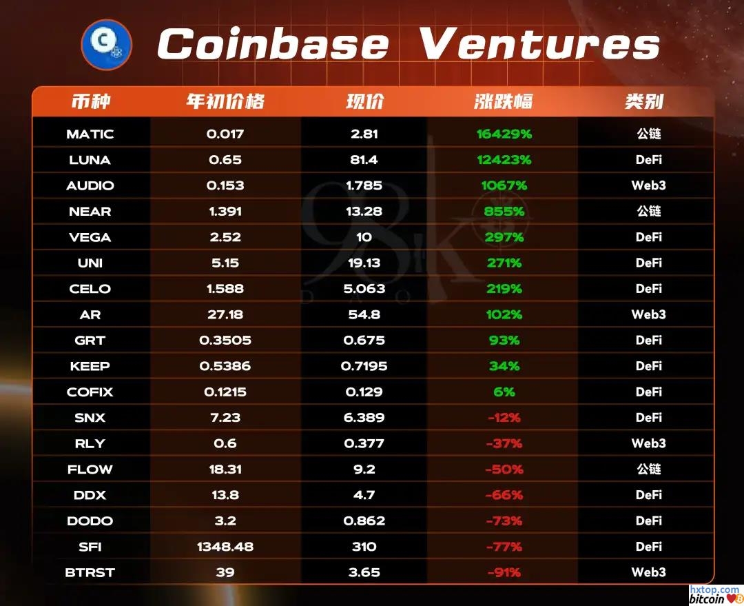 未发币项目总数量为19个,其中基础设施项目有8个,占比42%,其次是DeFi和GameFi项目。 Coinbase Ventures机构介绍:隶属于Coinbase的风险投资基金,总部位于旧金山,主要投资早期的加密货币和区块链初创公司,投资倾向是开放式的金融解决方案。 以下数据为Polychain Capital所投资且已发币项目在2021年的币价表现: