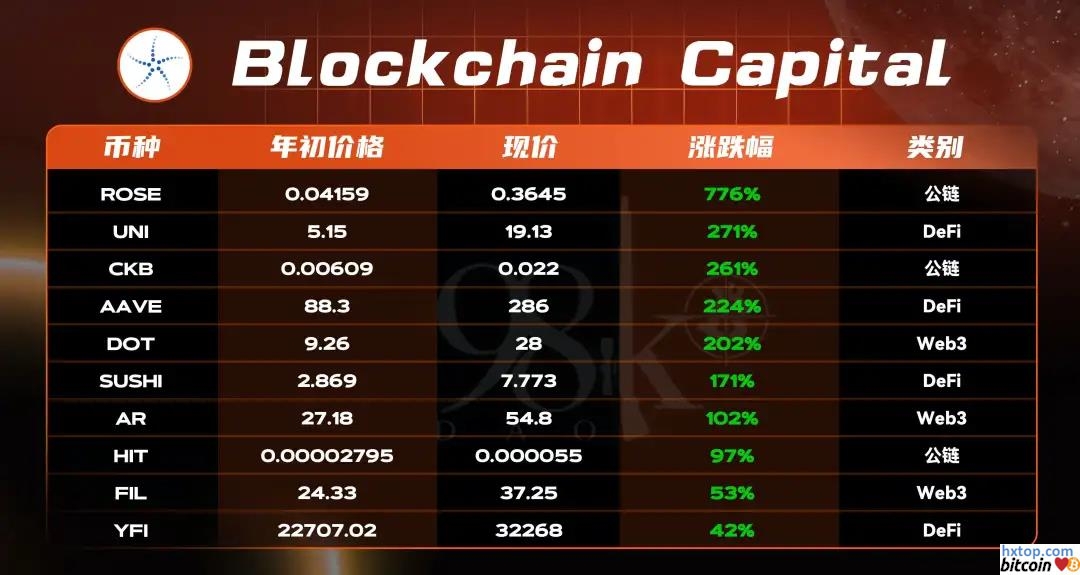 未发币项目总数量为60个,其中基础设施项目有43个,占比71%,其次为DeFi和Web3,NFT项目占比最少。 Blockchain Capital机构介绍:首个致力于比特币、区块链生态系统的风险投资基金。投资了 Coinbase、Ripple 等金融科技公司,是区块链行业顶尖的投资机构之一。 以下数据为Blockchain Capital所投资且已发币项目在2021年的币价表现: