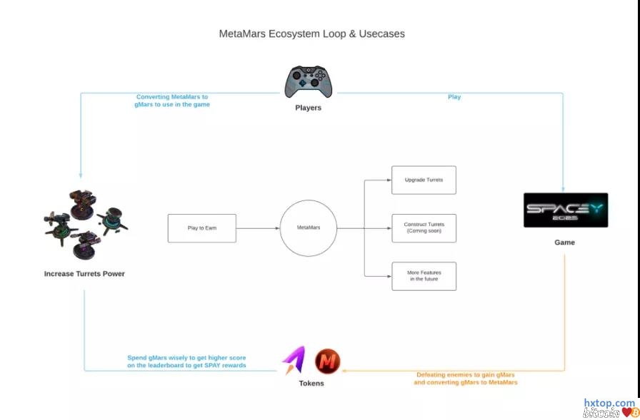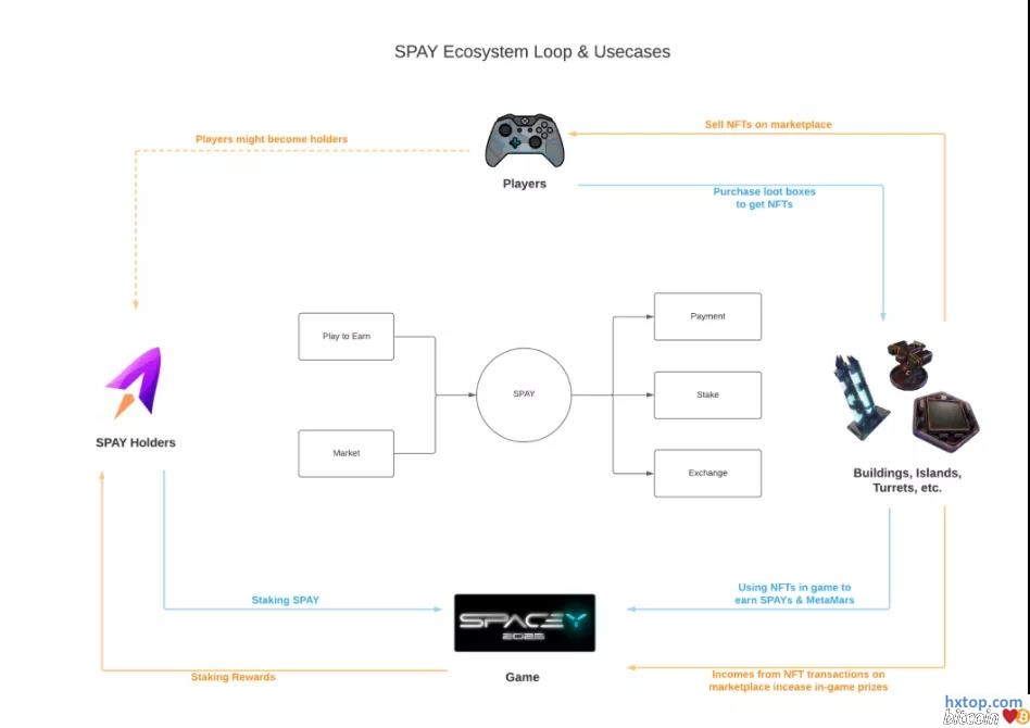 gMars:gMars 是游戏获得的资源,可转换为 MetaMars。转换比例为 1 比 1。玩家也可以将他们的 MetaMars 存入游戏成为 gMars。 SpaceY2025的经济活动目前依赖于两个功能——战斗和升级。战斗需要玩家获得多个炮塔 (NFT) 才能继续。游戏将为玩家提供 15 个非 NFT 的免费炮塔,让玩家“自由玩耍”。玩家将获得游戏内资源“gMars”,作为击败一波敌人的奖励。 gMars 可以转换为 MetaMars。之后,玩家可以将他们的 MetaMars 作为实际代币索取到钱包中。 SpaceY 2025 有一个排行榜机制,每月奖励排名最高的玩家一定数量的 SPAY 代币。如上图所示,生态系统在一个闭环内有四种交互形式。 这涉及玩家、NFT(建筑物、岛屿和炮塔)和核心代币(SPAY 和 MetaMars)。这两个循环代表了网络的价值消费和价值创造视角。 在蓝线代表的内循环中,用户进入生态系统使用 SPAY 购买战利品盒。然后他们使用从盒子中获得的 NFT 与网络交互以生成 MetaMars 并为自己赚取 SPAY。 |