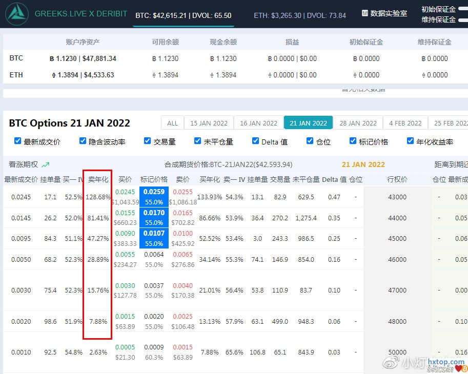 在最新版本的Greeks.live网页版服务中,在T型报价表下方的可选列中,有“年化收益率”可供选择。勾选之后,会出现如下图所示界面。