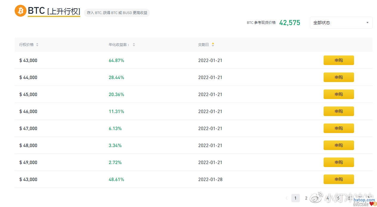 这里所示的“卖年化”即用户直接吃单卖出期权基于足额保证金备兑时的年化收益率。可以用它和同一期限的双币产品进行比较,如下图。
