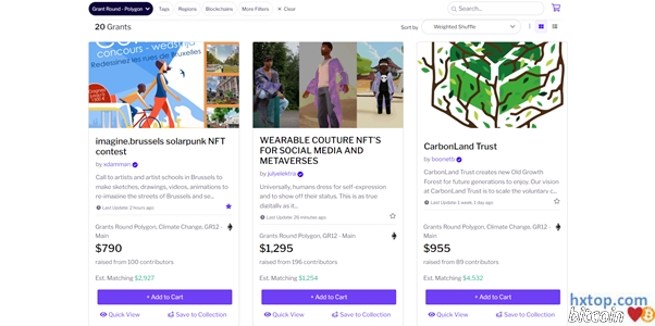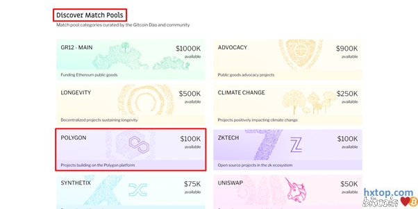 在 Gitcoin 主页,向下滚动到由 coojgn 共同分类的Discover Match Pools部分,会有很多项目类别,点击你要捐赠的类型,比如多边形系统。