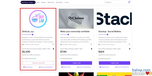 点击收藏时,从上往下拖拽,选择哪个项目,然后点击加入购物车,可以点击多个项目,类似购物一样加入购物车。 每个收藏都会有项目的预览,可以单击“快速查看”查看项目,然后做出捐赠决定或不捐赠。 或者如果你知道项目名称,可以在右上角搜索。