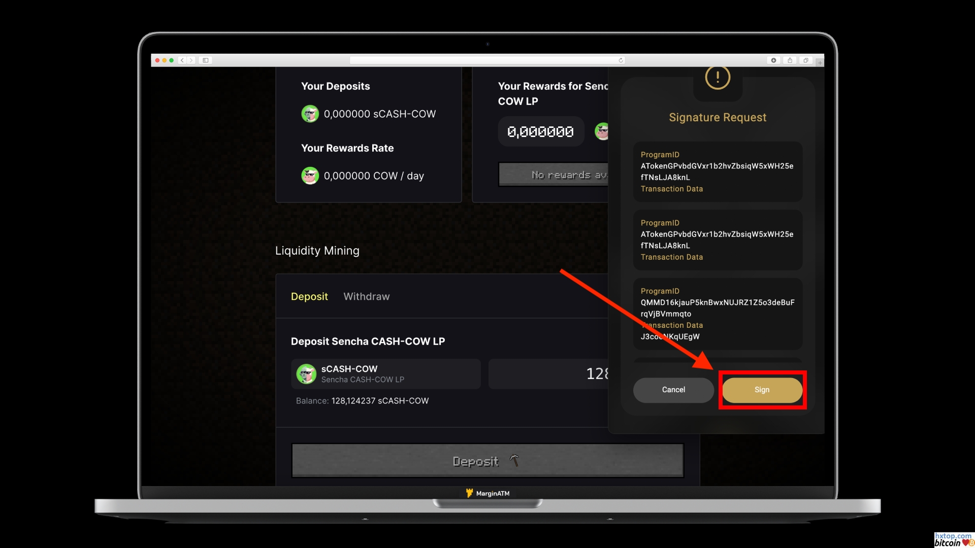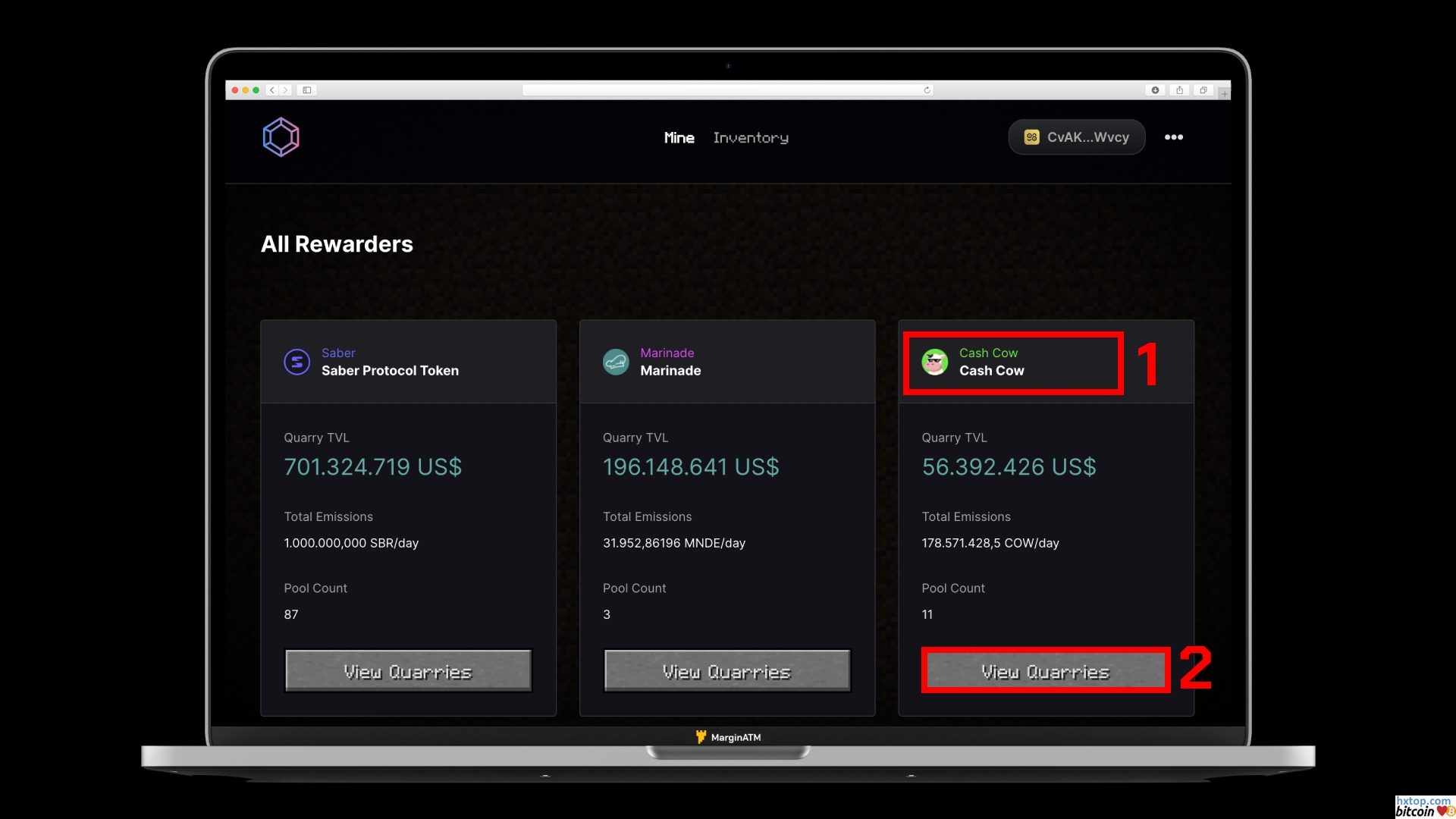 第1步:在 Sencha 上添加 LP 对后,返回 Quarry 界面并向下滚动。在“存款”字段 (1) 中,输入要添加的 LP Cash-Cow 数量 (2) → 选择“存款”。 注意:在 Quarry 上存入 LP 代币时,你应该在钱包里准备一点 SOL 作为费用。